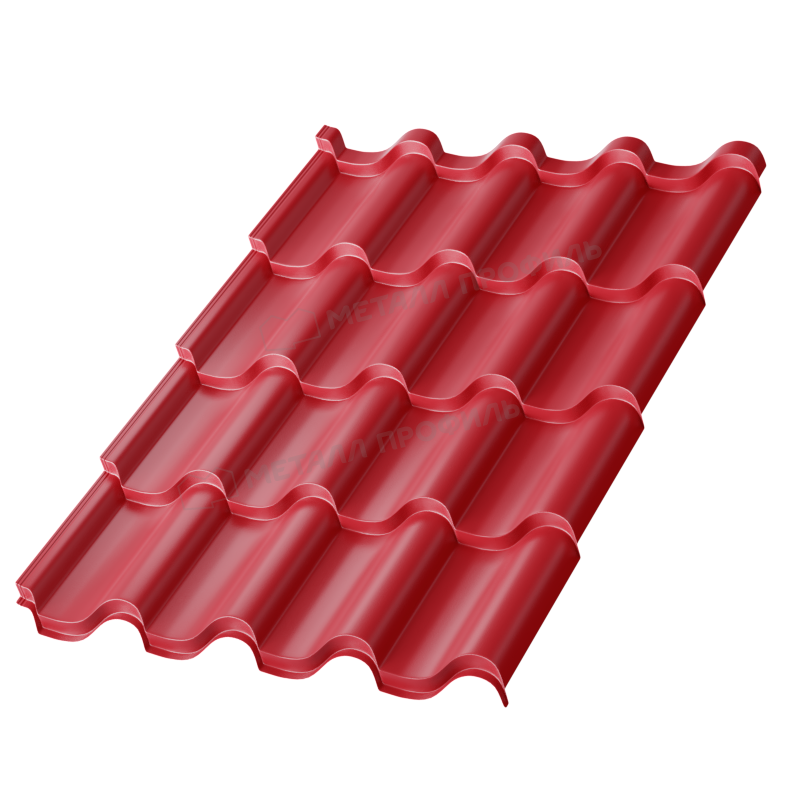 Профиль имитирует классическую керамическую черепицу с плавными волнами и симметричным дизайном. Высота волны составляет 24 мм, шаг – 350 мм, что обеспечивает оптимальную жесткость и эстетичный вид. Общая ширина листа – 1190 мм, полезная – 1100 мм, что упрощает расчет и монтаж. Профиль адаптирован для скатов с уклоном от 12 градусов, предотвращая скопление снега и воды. Он отличается повышенной несущей способностью благодаря ребрам жесткости.
